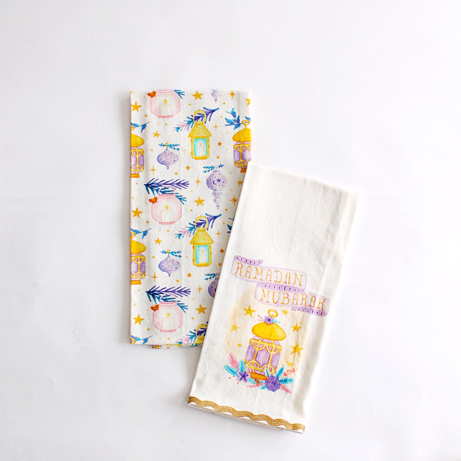 Hand painted watercolor art gets transformed into these pretty Ramadan tea towels. Available as a set of two. Measures 20” x 30” each. 100% cotton. Made in India.